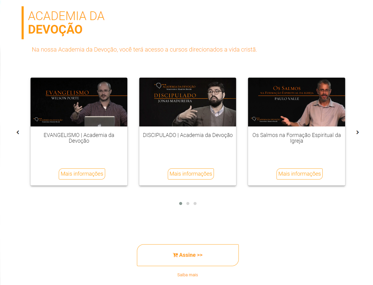 Através da plataforma desenvolvida, o cliente consegue comercializar os mais variados cursos separados em duas grandes áreas, a academia da devoção e cursos avulsos.