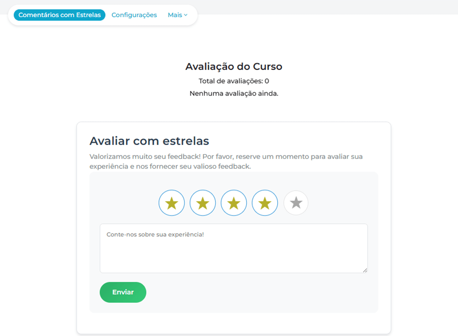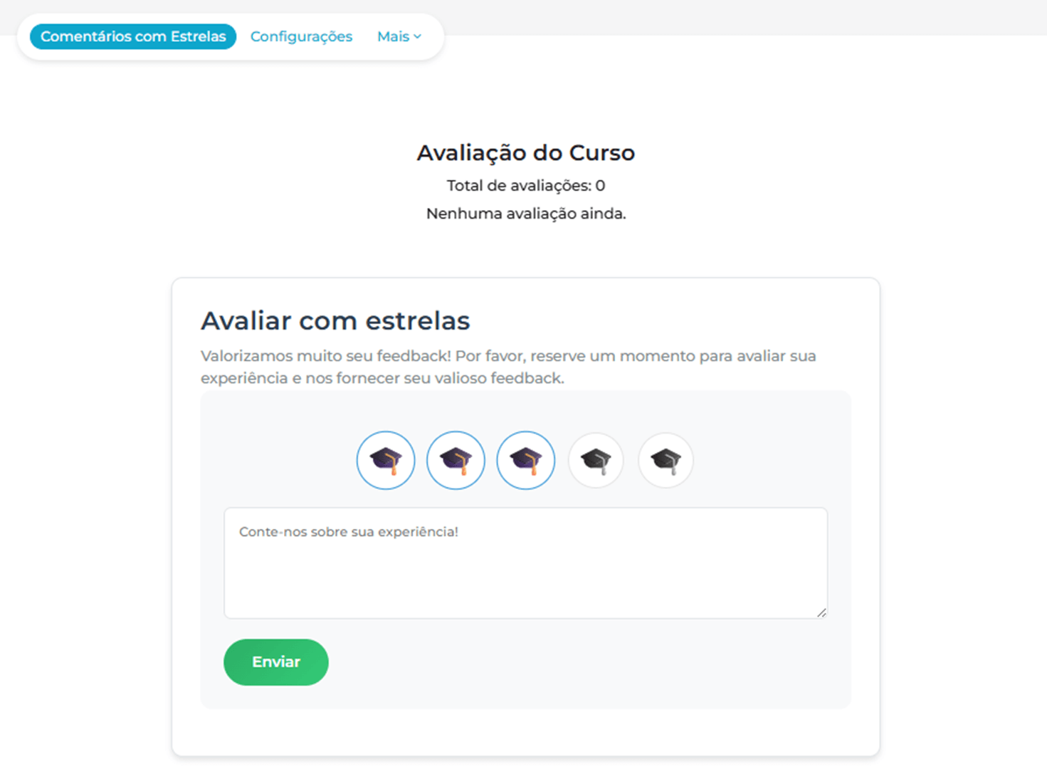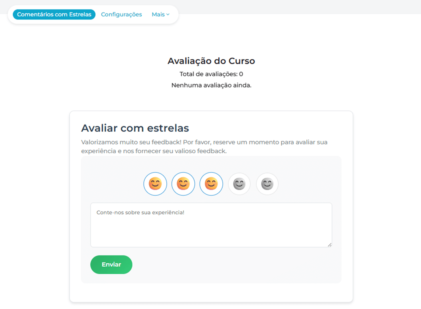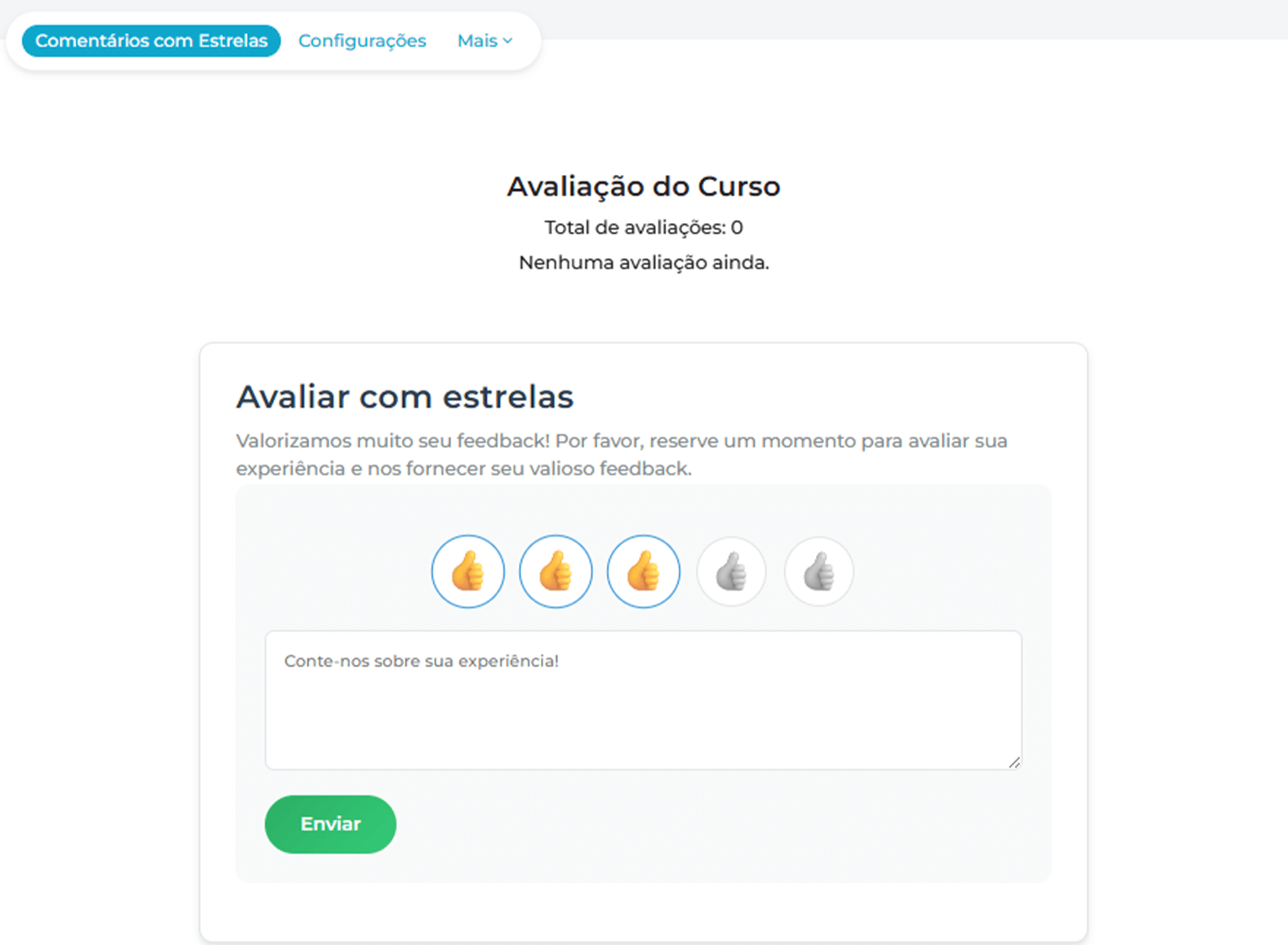 Com ele, o aluno pode avaliar o curso diretamente dentro do ambiente virtual, atribuindo notas em formato de estrelas ⭐️ ou ícones personalizados 👍 — e deixar um comentário opcional.