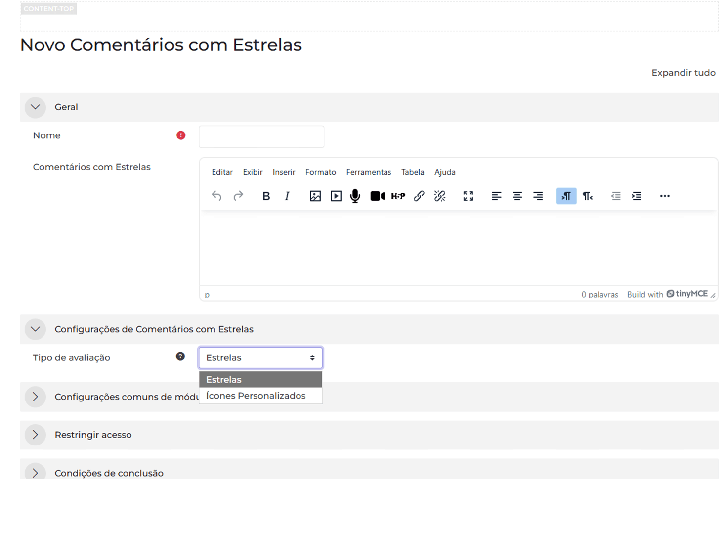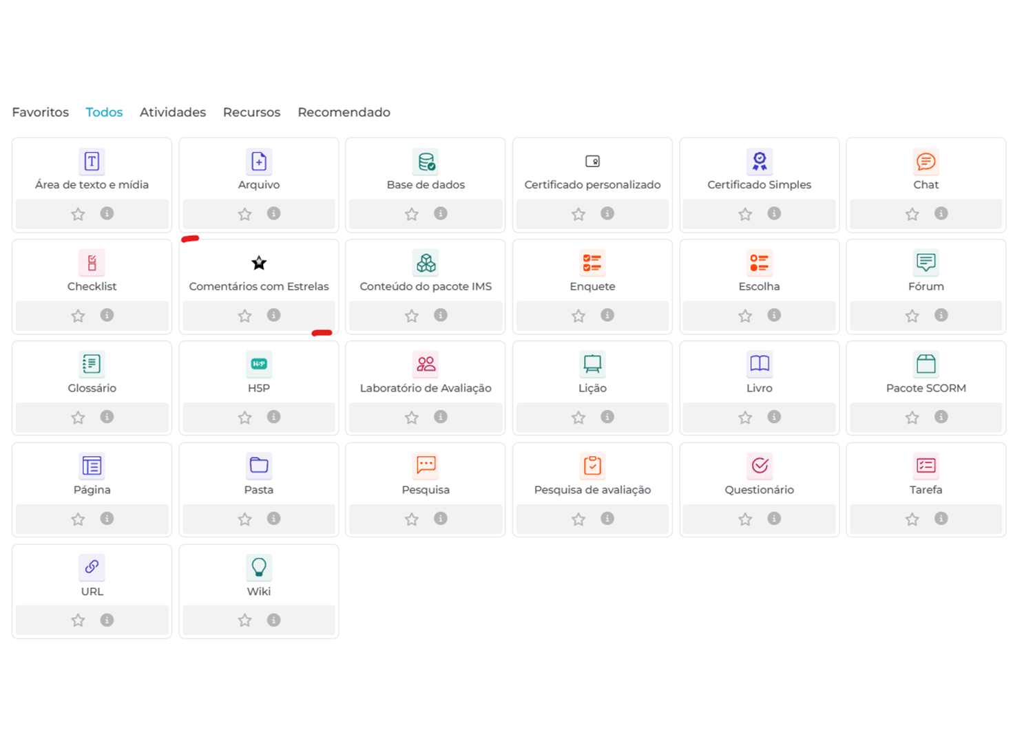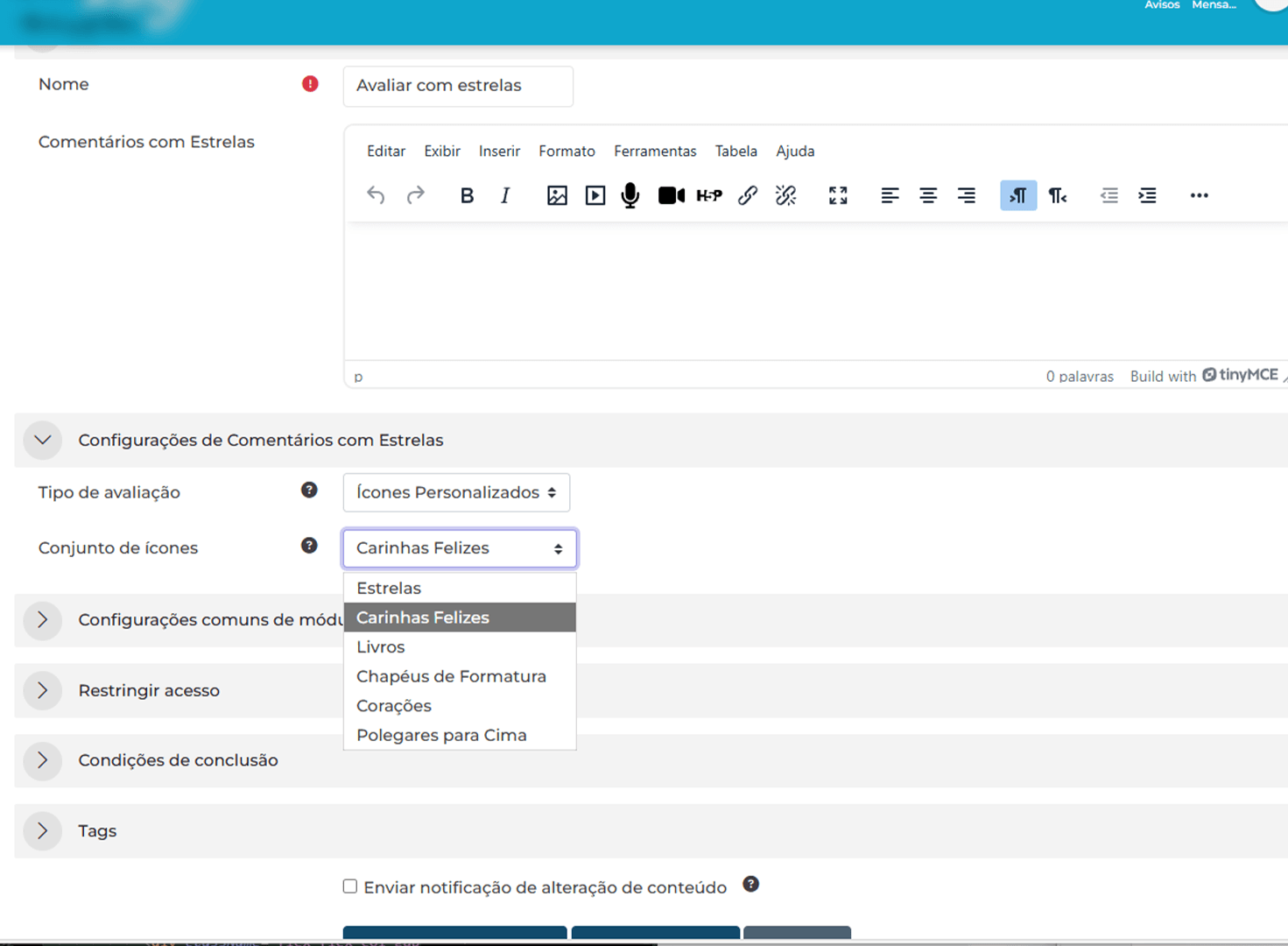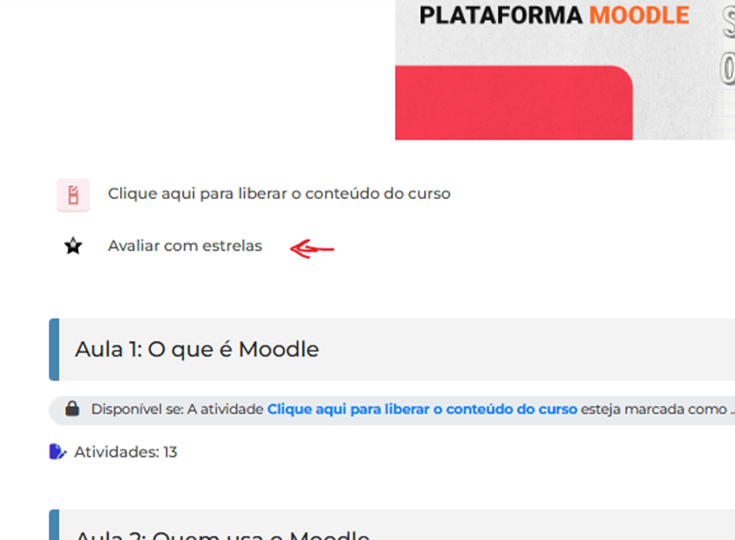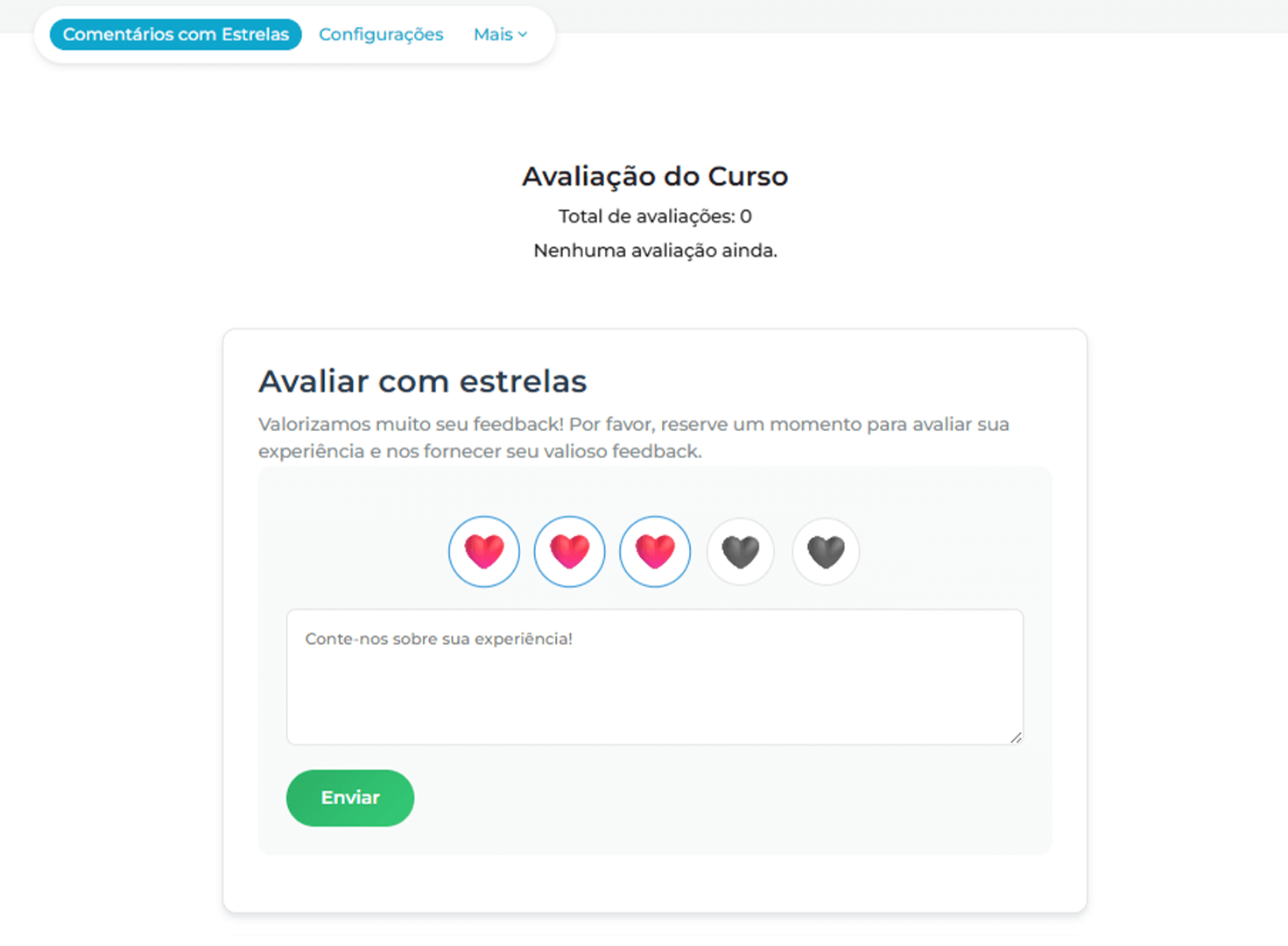 Com ele, o aluno pode avaliar o curso diretamente dentro do ambiente virtual, atribuindo notas em formato de estrelas ⭐️ ou ícones personalizados 👍 — e deixar um comentário opcional.